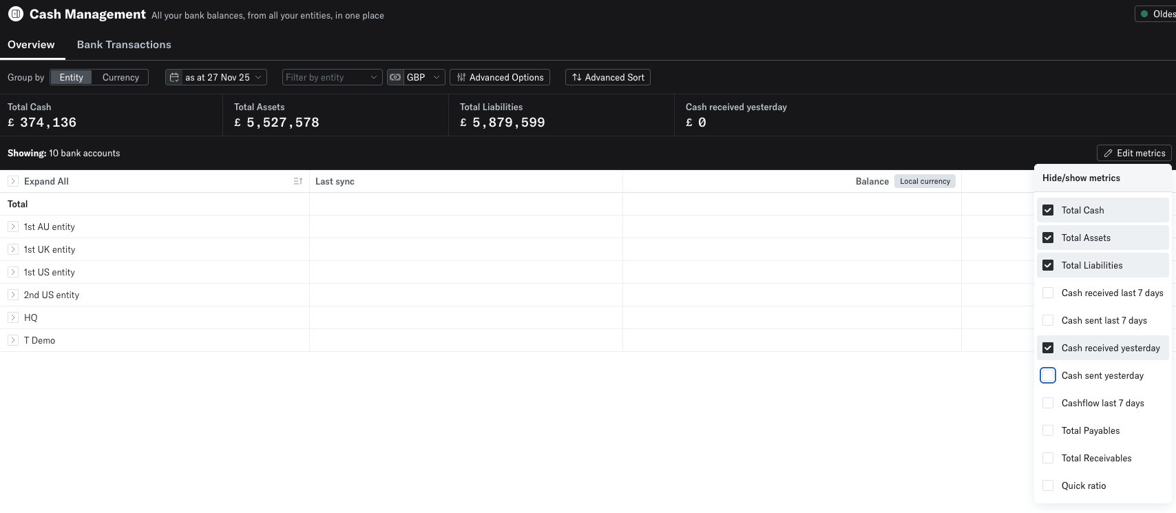You can now view all your bank balances from all our entities in one place with our Cash Management app and easily export the data to a spreadsheet.