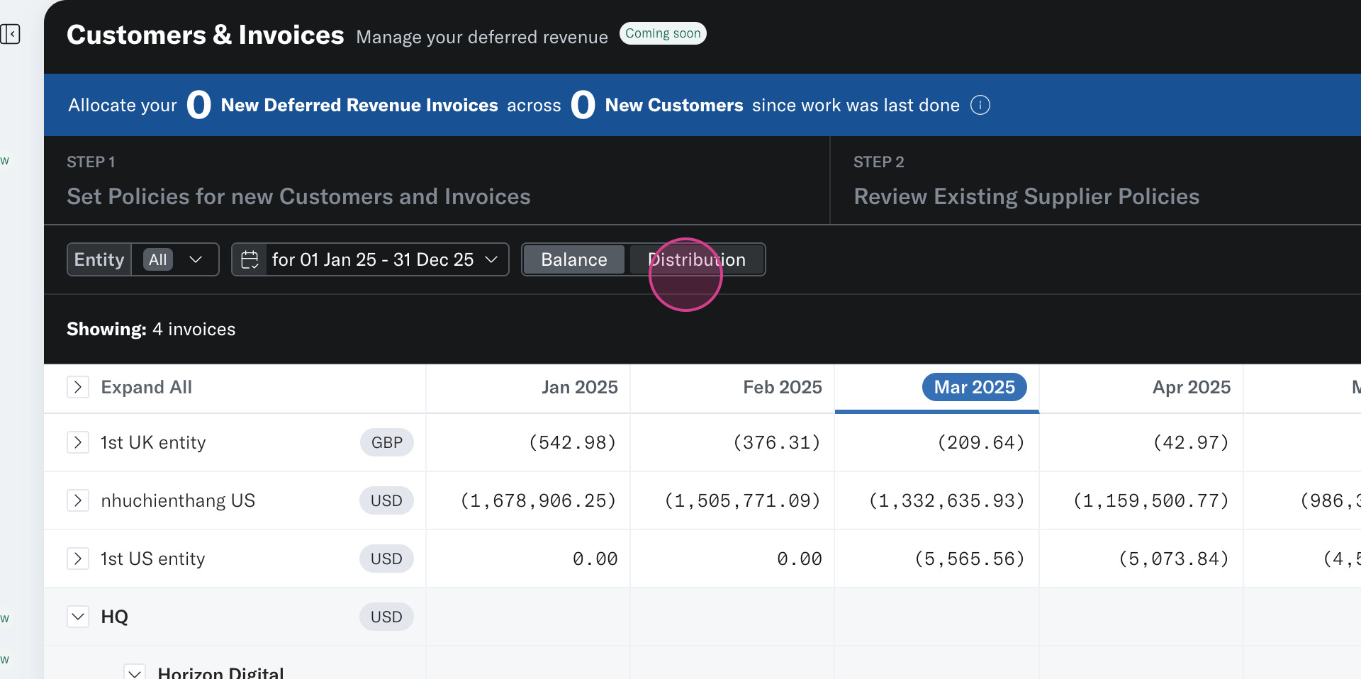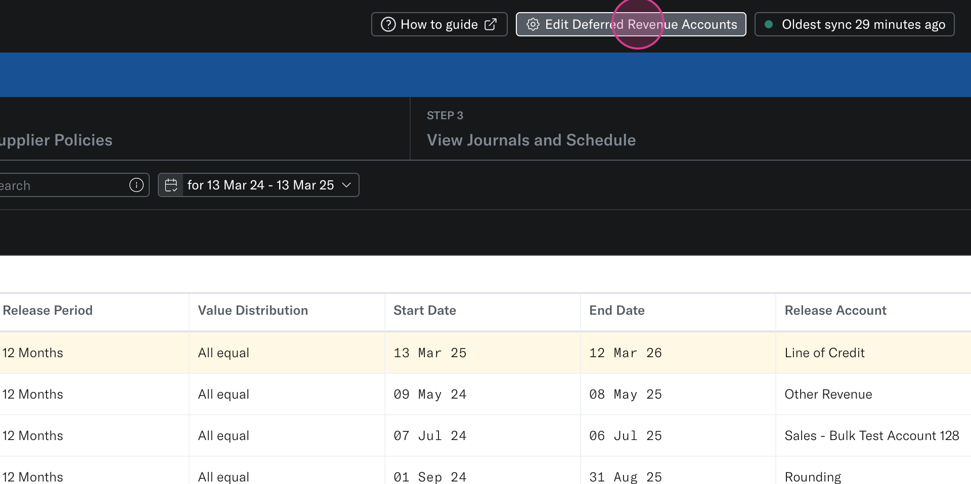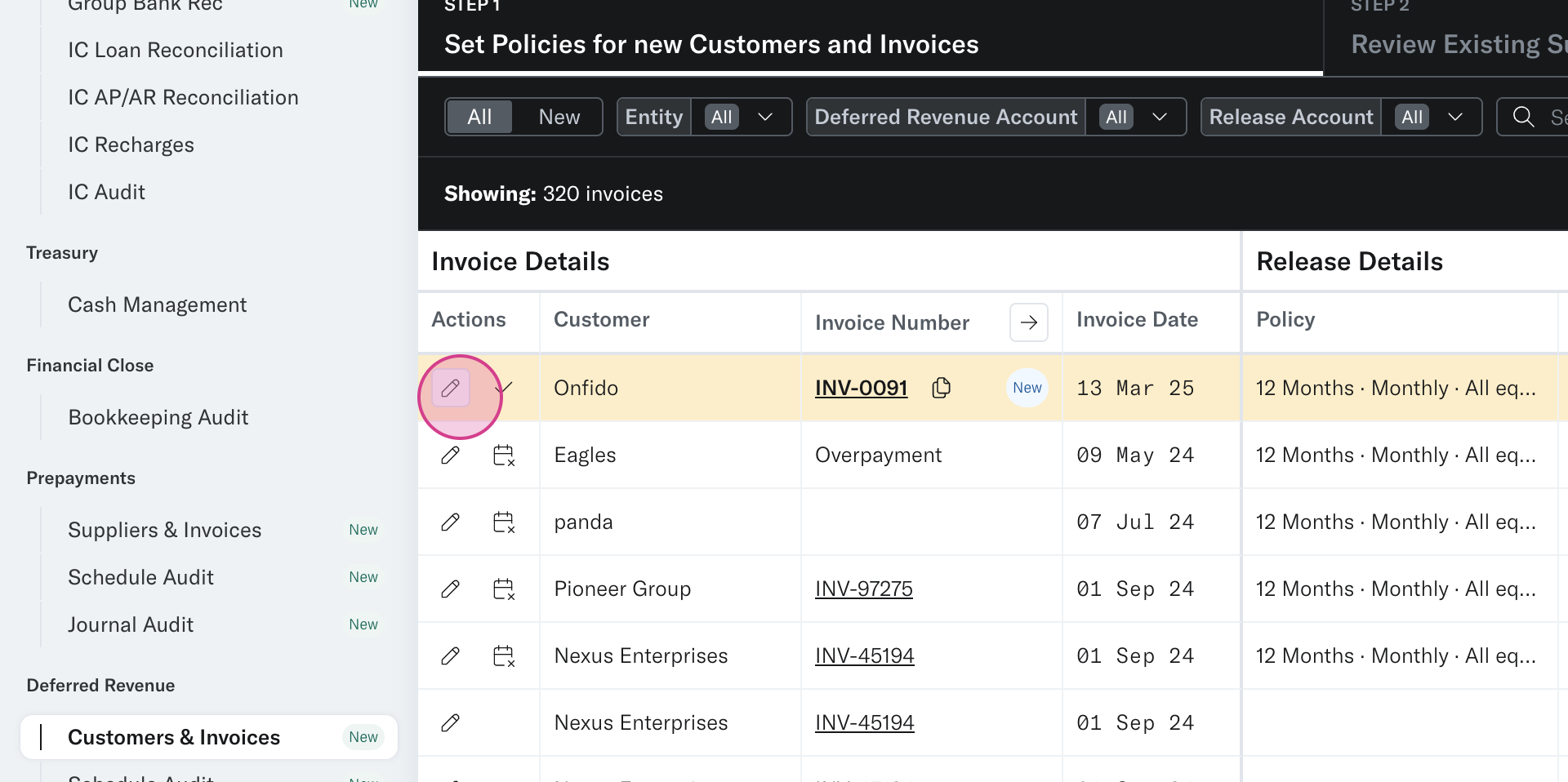 Step 7: In step 3 of the Invoices and Customer Tool, review the Deferred Revenue schedule based on the policies and release accounts allocated to your invoices. Schedules are grouped by entity and can be broken down on a customer/invoice level.