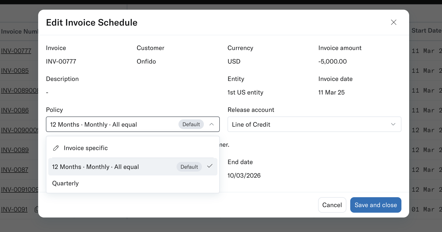 Step 5: For new invoices from new customers, Translucent automatically allocates the default policy. To align with how you want to distribute the prepaid expense, edit the: