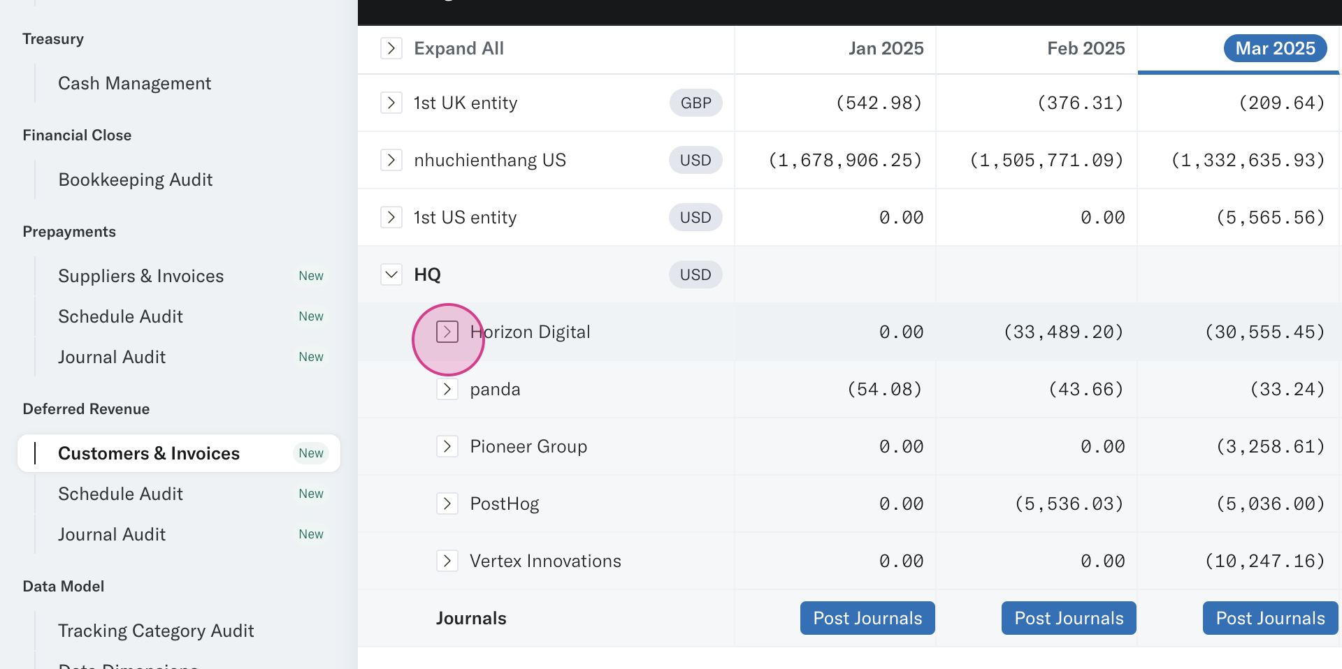 Step 10: Drill down into the Journal Audit Tool to see all journals posted from the underlying source or from Translucent. You’ll also see customer names allocated to each journal, which should be helpful for variance analysis at the end of the month.