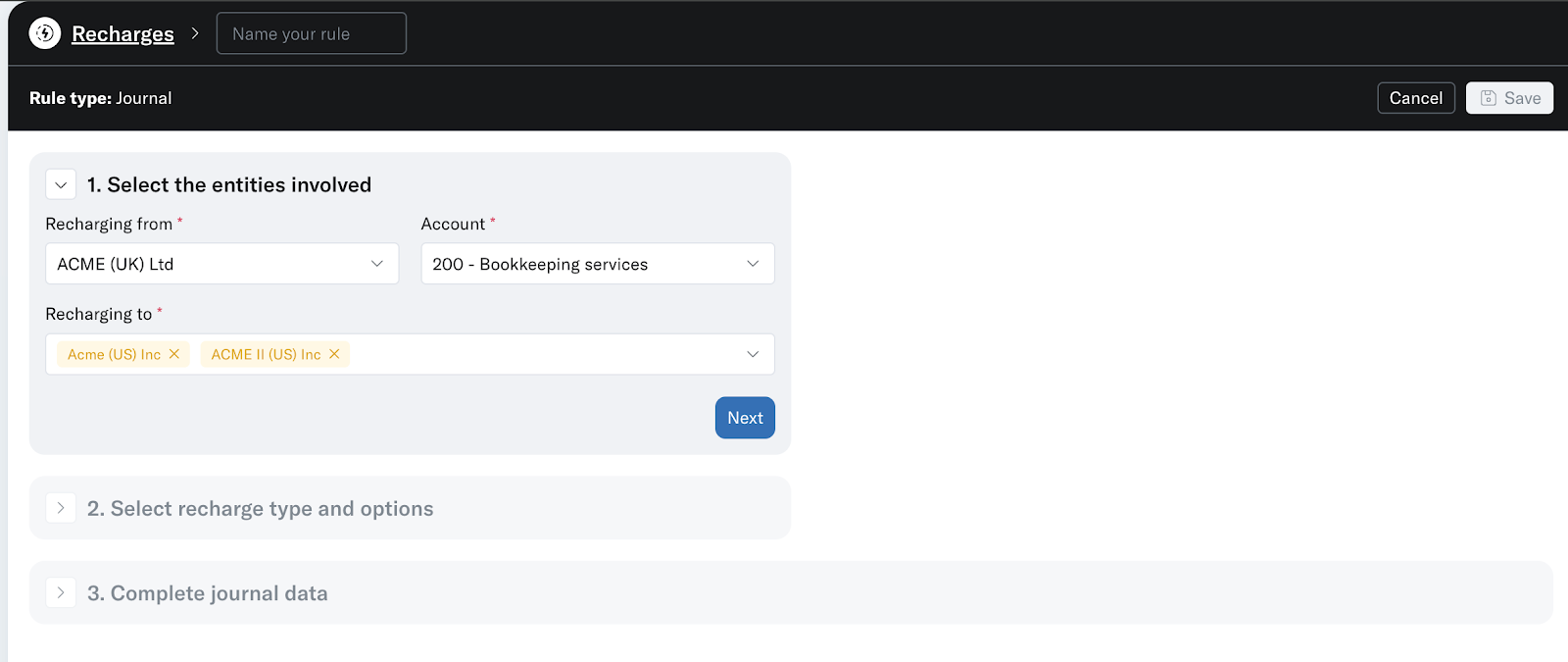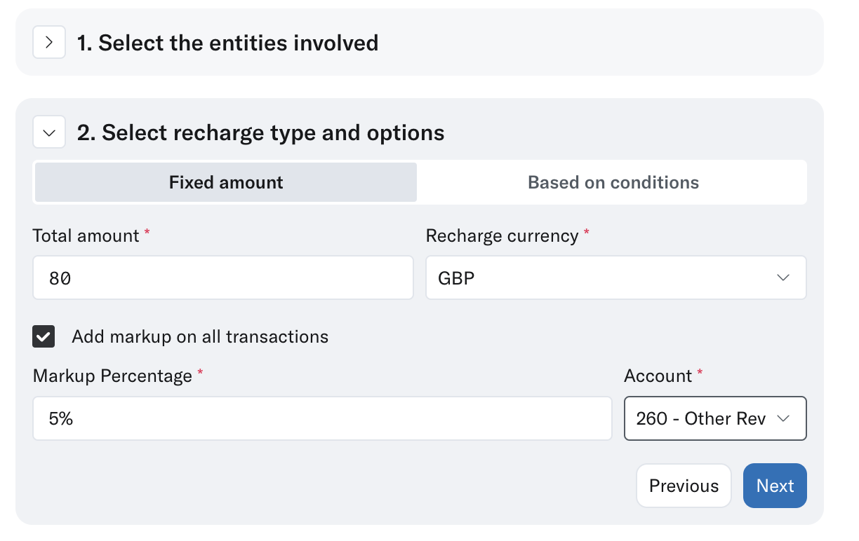 Select the entity and account you want to recharge from and which entity you want to recharge to. You can recharge to multiple accounts.