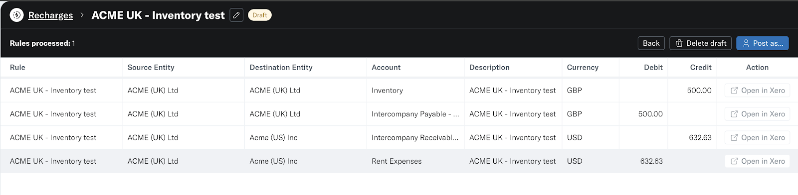 Once you have Run the recharge you will see all your prepared journals in the ‘Runs’ tab. Here you can see all the source entities, destination entities and the amounts. You can post these to Xero by pressing the blue ‘Post as’ button in the top right side.