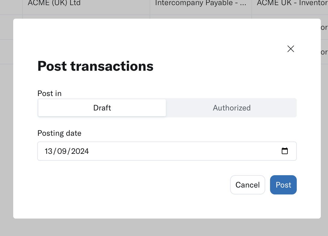 You can select whether you want to post these as a draft or as an authorized, select the posting date and you post them.