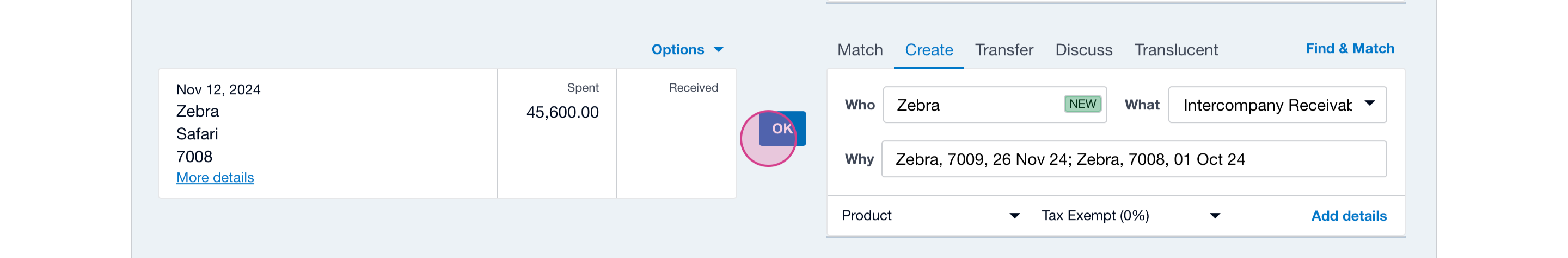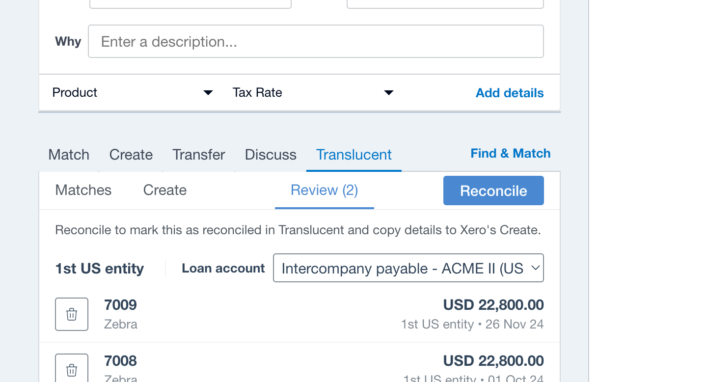 Using the Group Bank Reconciliation Create functionality in Translucent allows you to create new transactions within other entities in your group and mark them as paid.