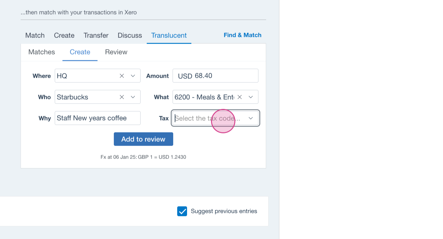 Step 5: This action will take you to Xero's regular Create page, where you can complete the reconciliation.