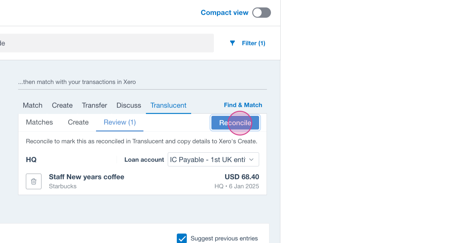 Step 1: Navigate to the Bank reconciliation screen in Xero and select the newly added Translucent action.