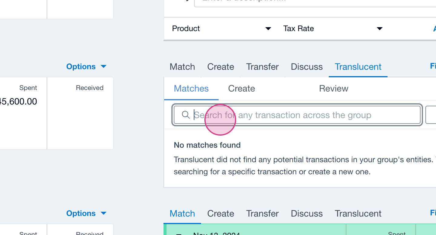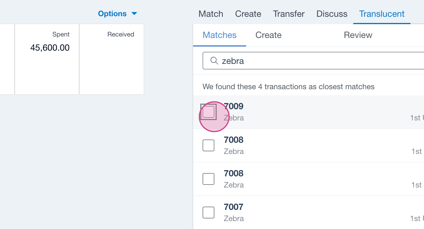Step 2: Translucent attempts to find the closest matches to the bank statement line. If none of these are correct or if no matches appear, use the search bar to find invoices based on name or reference number.